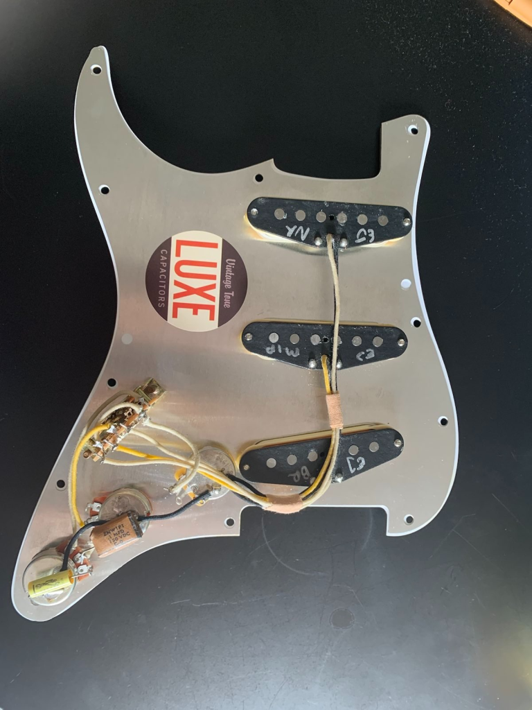 This week we took apart a well-loved Fender Stratocaster and rebuilt it like a ’60s workhorse—waxed cloth push-back wire, vintage-spec AlNiCo pickups, CTS pots, CRL 5-way, and a proper treble bleed so the sparkle stays when you roll back the volume. We redressed the cavity with copper shielding, ran neat, right-angle harness routes, and flowed low-temp solder for clean, shiny joints (yes, plenty of tidy wiring close-ups for the soldering nerds). The trem got fresh springs, a floated setup, and a bone nut to keep bends in tune.