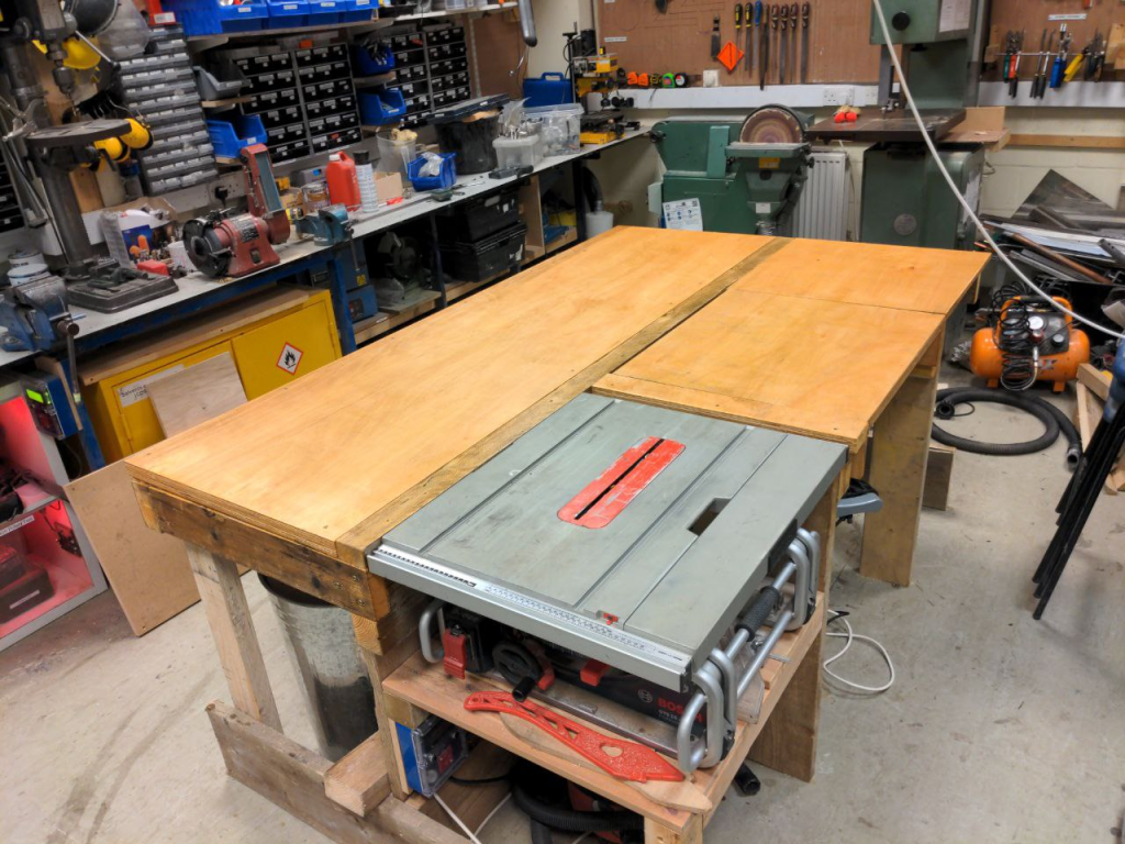 Originally built for a communal workshop used by lots of people, this bench proved it could take abuse and stay true. We’ve now open-sourced the design so anyone can build, adapt, and improve it. It uses reclaimed scaffolding boards, sacrificial plywood skins for a dead-flat surface, and modular bays for a table saw, flip-up mitre saw, and router—ready for future drawers, vises, and clamps.